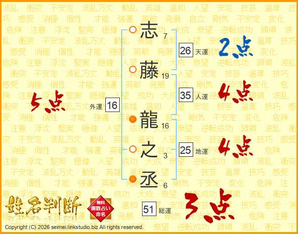 志(7画)藤(19画) 龍(16画)之(3画)丞(6画)