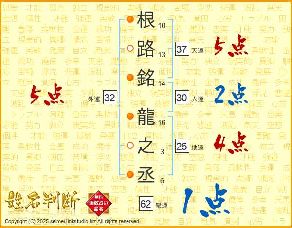 根路銘龍之丞さんの総運は62画の1点!