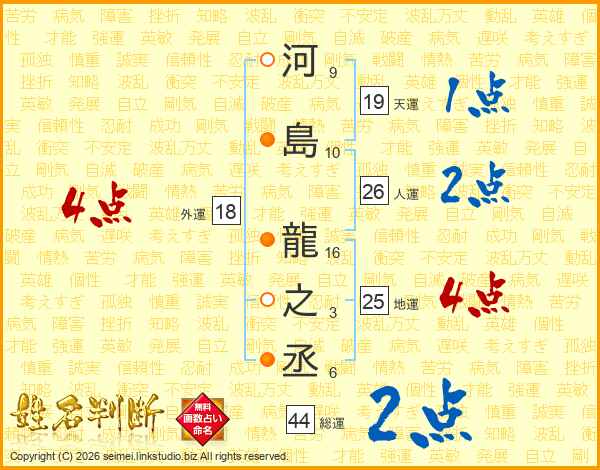 河(9画)島(10画) 龍(16画)之(3画)丞(6画)