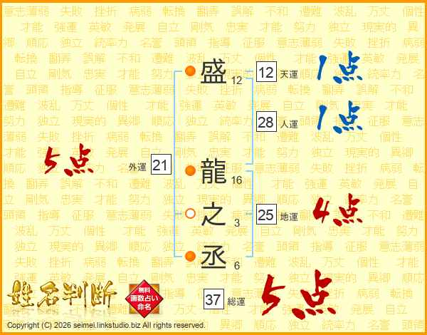 盛龍之丞さんの総運は37画の5点!