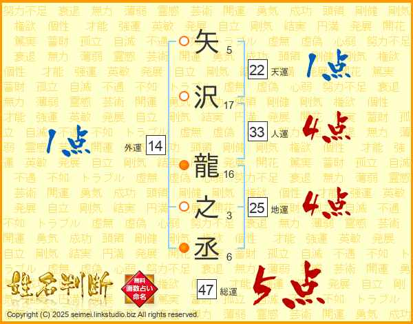 矢(5画)沢(17画) 龍(16画)之(3画)丞(6画)