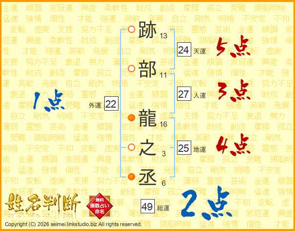 跡部龍之丞さんの総運は49画の2点!