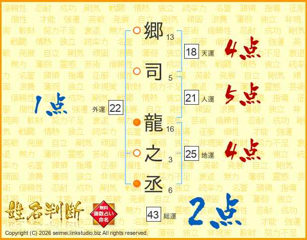 郷(13画)司(5画) 龍(16画)之(3画)丞(6画)