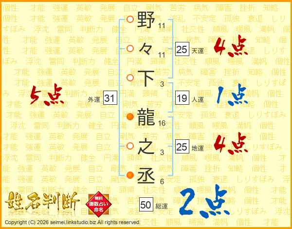 野(11画)々(11画)下(3画) 龍(16画)之(3画)丞(6画)