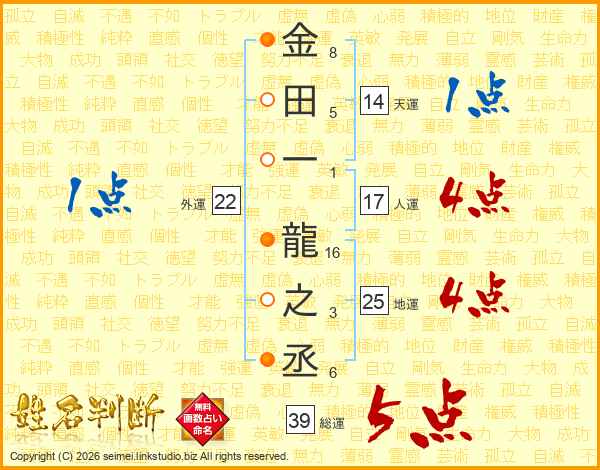 金(8画)田(5画)一(1画) 龍(16画)之(3画)丞(6画)