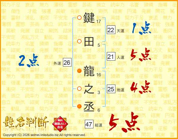 鍵(17画)田(5画) 龍(16画)之(3画)丞(6画)
