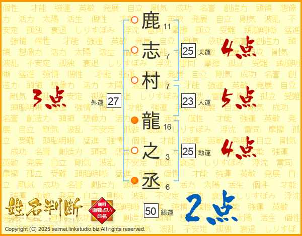 鹿(11画)志(7画)村(7画) 龍(16画)之(3画)丞(6画)