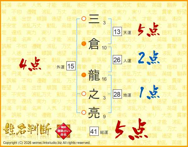 三倉龍之亮さんの総運は41画の5点!