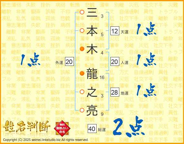 三(3画)本(5画)木(4画) 龍(16画)之(3画)亮(9画)
