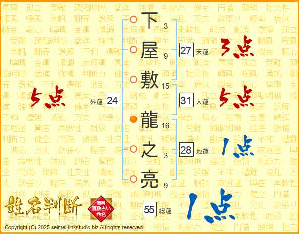 下(3画)屋(9画)敷(15画) 龍(16画)之(3画)亮(9画)