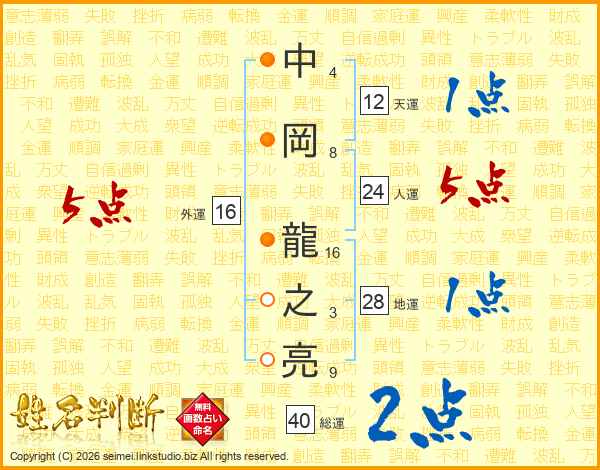 中岡龍之亮さんの人運は24画の5点!