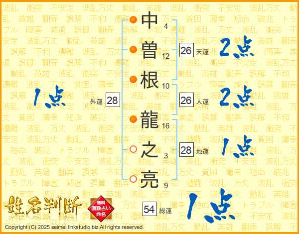 中(4画)曽(12画)根(10画) 龍(16画)之(3画)亮(9画)