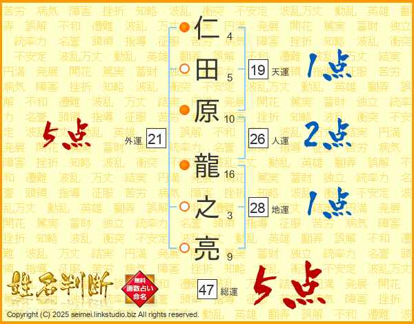 仁(4画)田(5画)原(10画) 龍(16画)之(3画)亮(9画)