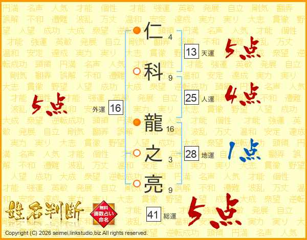 仁(4画)科(9画) 龍(16画)之(3画)亮(9画)