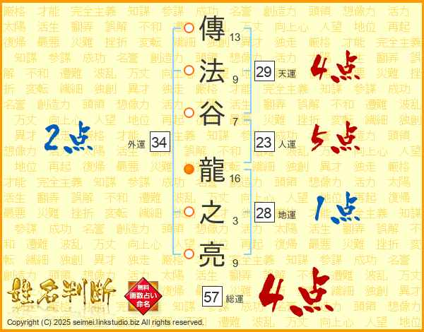 傳(13画)法(9画)谷(7画) 龍(16画)之(3画)亮(9画)