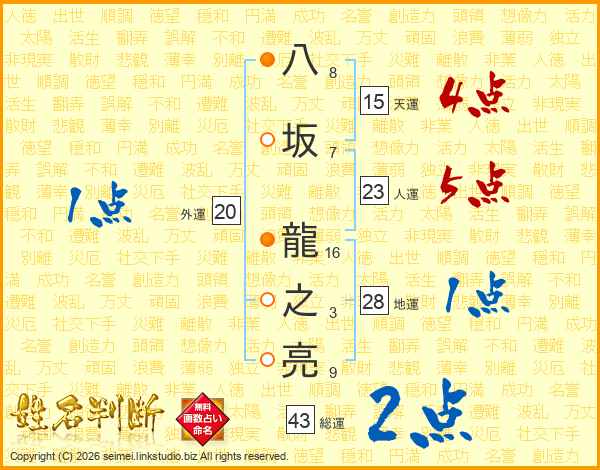 八坂龍之亮さんの総運は43画の2点!