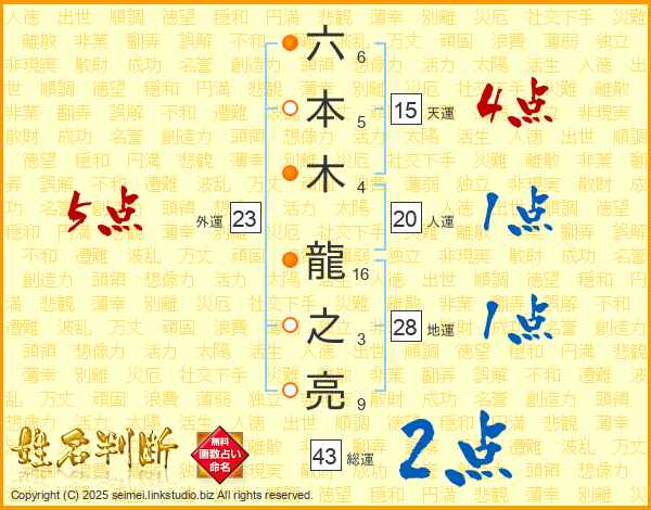 六(6画)本(5画)木(4画) 龍(16画)之(3画)亮(9画)