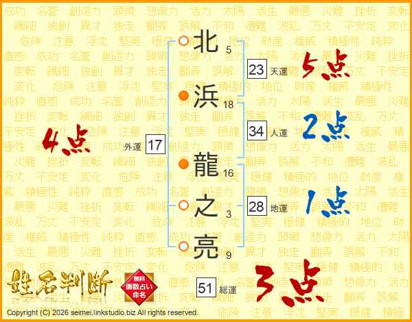 北浜龍之亮さんの総運は51画の3点!