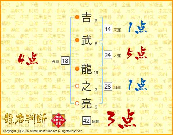 吉武龍之亮さんの人運は24画の5点!