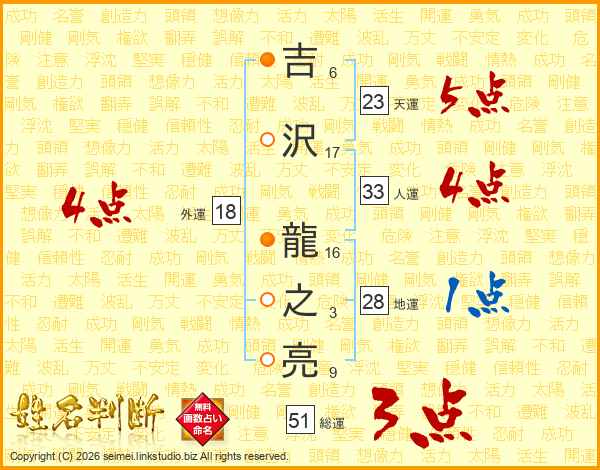 吉(6画)沢(17画) 龍(16画)之(3画)亮(9画)