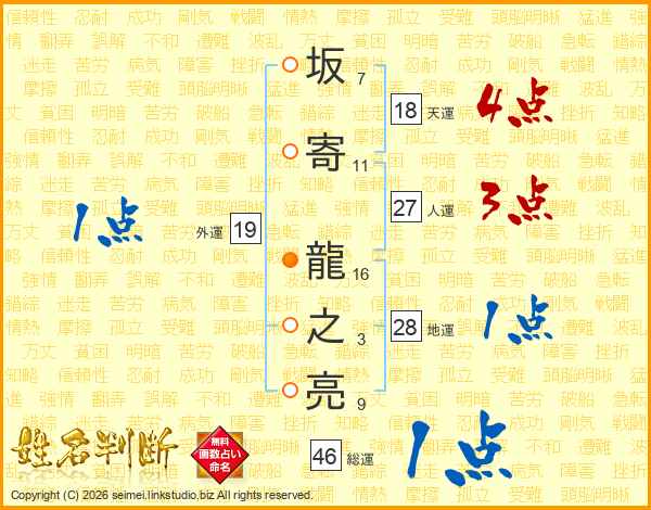 坂寄龍之亮さんの人運は27画の3点!