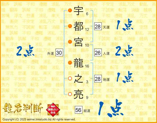 宇(6画)都(12画)宮(10画) 龍(16画)之(3画)亮(9画)