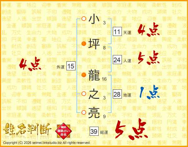 小(3画)坪(8画) 龍(16画)之(3画)亮(9画)