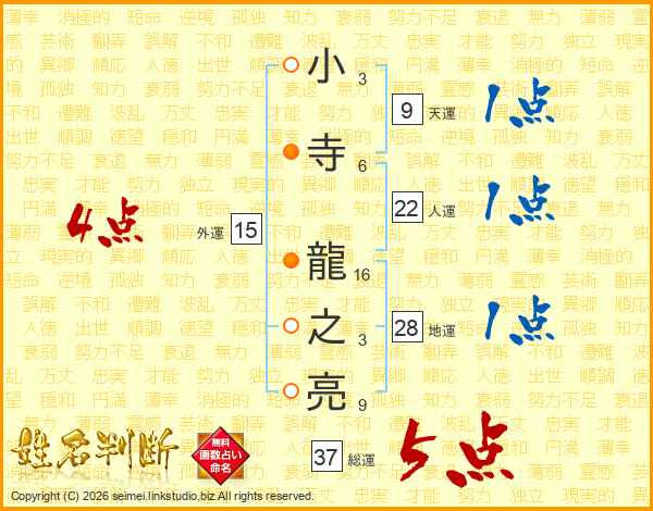 小寺龍之亮さんの総運は37画の5点!