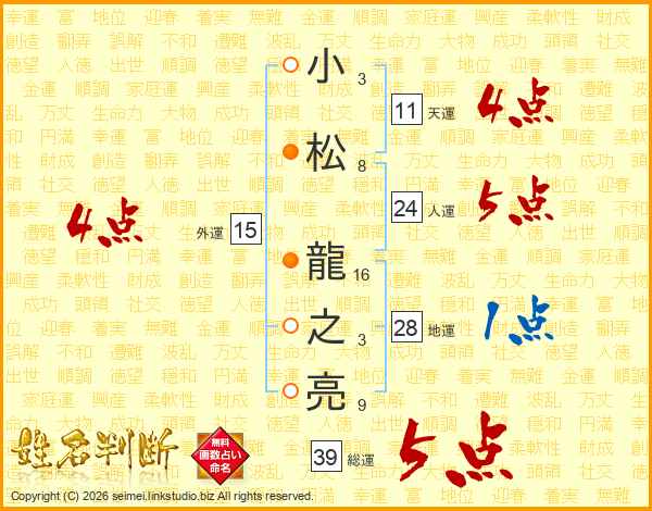 小(3画)松(8画) 龍(16画)之(3画)亮(9画)