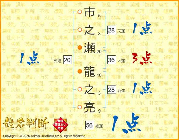 市(5画)之(3画)瀬(20画) 龍(16画)之(3画)亮(9画)