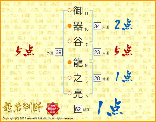 御(11画)器(16画)谷(7画) 龍(16画)之(3画)亮(9画)