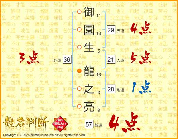 御(11画)園(13画)生(5画) 龍(16画)之(3画)亮(9画)