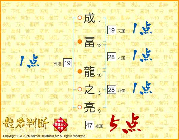 成冨龍之亮さんの総運は47画の5点!