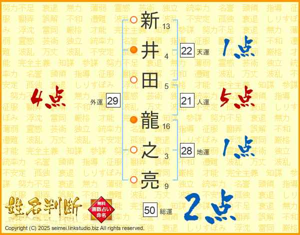 新(13画)井(4画)田(5画) 龍(16画)之(3画)亮(9画)