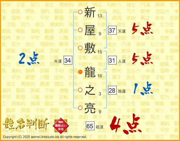 新(13画)屋(9画)敷(15画) 龍(16画)之(3画)亮(9画)
