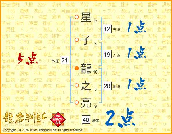 星(9画)子(3画) 龍(16画)之(3画)亮(9画)