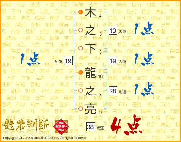 木(4画)之(3画)下(3画) 龍(16画)之(3画)亮(9画)