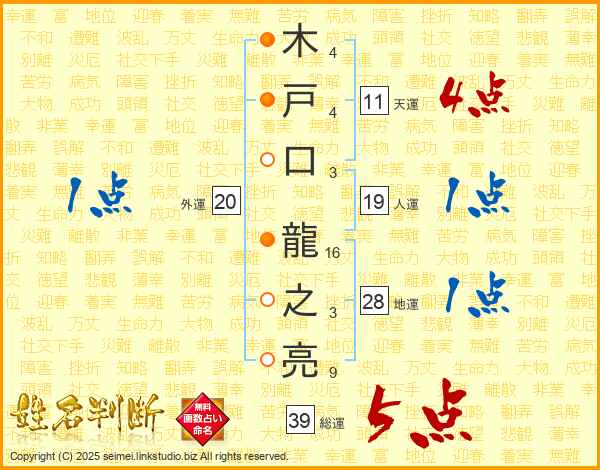 木(4画)戸(4画)口(3画) 龍(16画)之(3画)亮(9画)