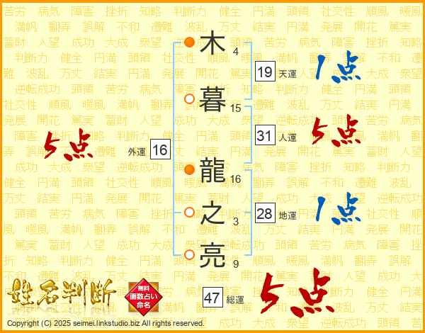 木(4画)暮(15画) 龍(16画)之(3画)亮(9画)