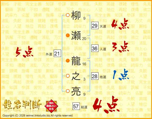 柳(9画)瀬(20画) 龍(16画)之(3画)亮(9画)
