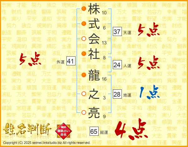 株(10画)式(6画)会(13画)社(8画) 龍(16画)之(3画)亮(9画)