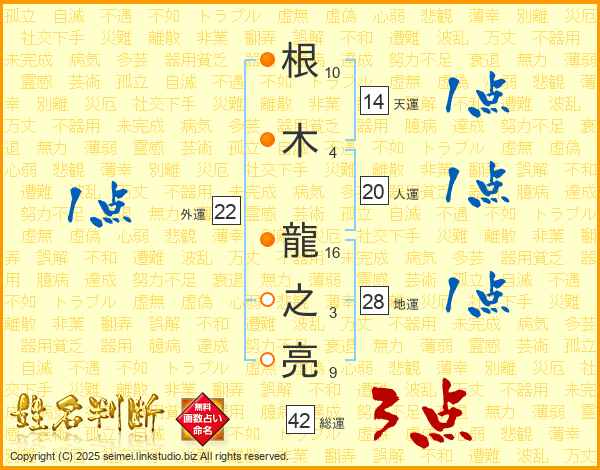 根(10画)木(4画) 龍(16画)之(3画)亮(9画)