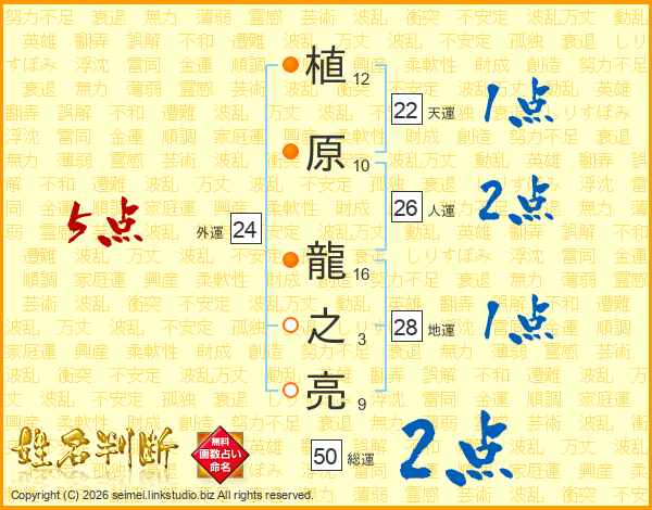 植(12画)原(10画) 龍(16画)之(3画)亮(9画)