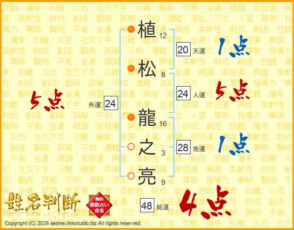 植(12画)松(8画) 龍(16画)之(3画)亮(9画)
