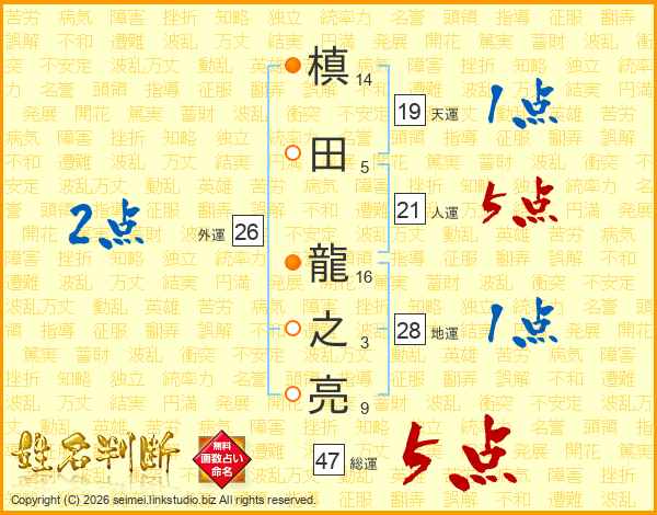 槙(14画)田(5画) 龍(16画)之(3画)亮(9画)