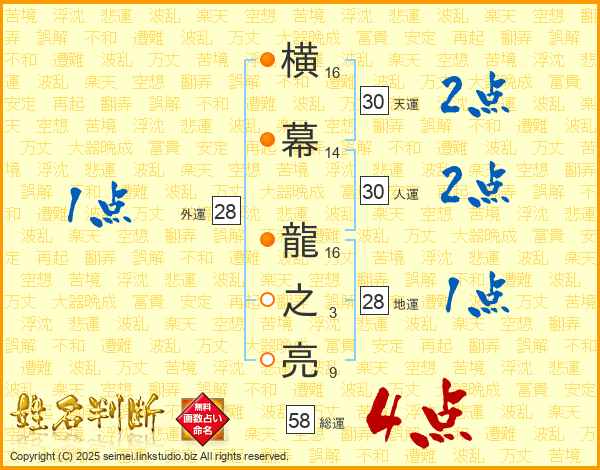 横(16画)幕(14画) 龍(16画)之(3画)亮(9画)