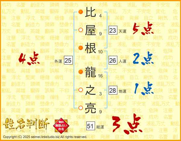 比(4画)屋(9画)根(10画) 龍(16画)之(3画)亮(9画)