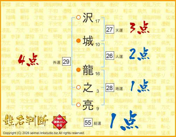 沢(17画)城(10画) 龍(16画)之(3画)亮(9画)