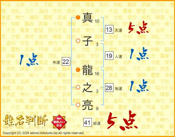 真子龍之亮さんの総運は41画の5点!