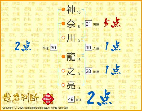 神(10画)奈(8画)川(3画) 龍(16画)之(3画)亮(9画)